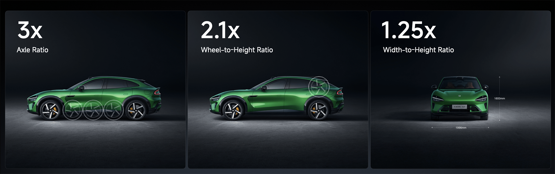 Что касается экстерьера, то соотношение колесной базы к кузову 3:1, соотношение колес к высоте 2,1:1 и соотношение ширины к высоте 1,25:1 формируют основу его привлекательного внешнего вида. Эти тщательно сбалансированные пропорции придают Xiaomi YU7 классическую низкую посадку высокопроизводительных внедорожников. Благодаря широкому кузову и мускулистому заднему профилю Xiaomi YU7 передает отчетливо спортивный характер. По сравнению с традиционными внедорожниками, эти элементы придают Xiaomi YU7 чувство пропорции, посадку и контуры, которые намного превосходят его класс, оставляя незабываемое впечатление с первого взгляда.